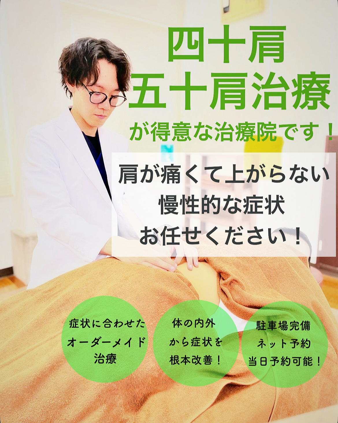 当院では四十肩・五十肩がなぜ起こっているのかを明確にし、ただ症状を緩和させるだけでなく再発しないよう原因から根本的に治療を行います!
