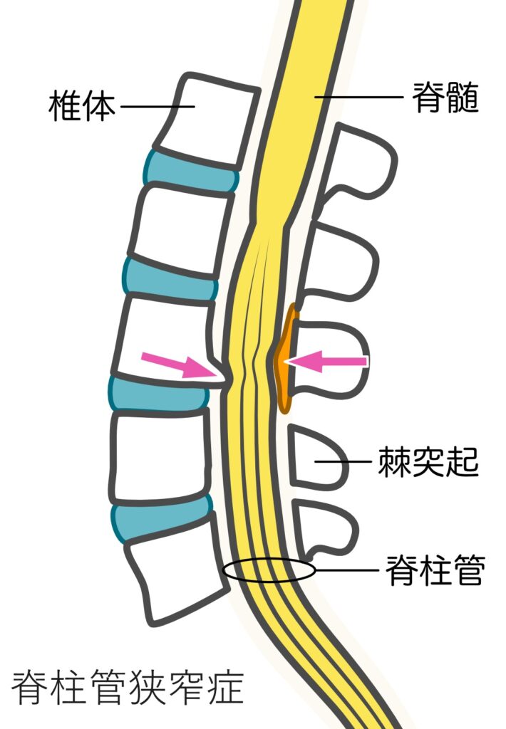腰の部位辺りの脊柱管(神経の通り道)が狭くなることで神経が圧迫され腰痛の他にも足のしびれ、長く歩けない、残尿感などが生じます。