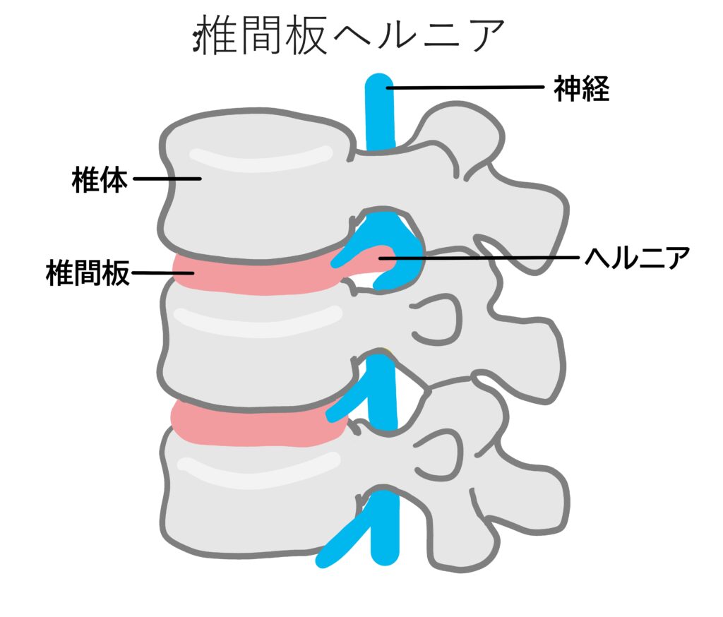 この椎間板の内容物が衝撃や度重なるストレスなどにより飛び出してしまい飛び出た部分が神経を圧迫するなどして腰部、臀部(おしり)の痛み、下肢(足)のしびれなどが生じます。