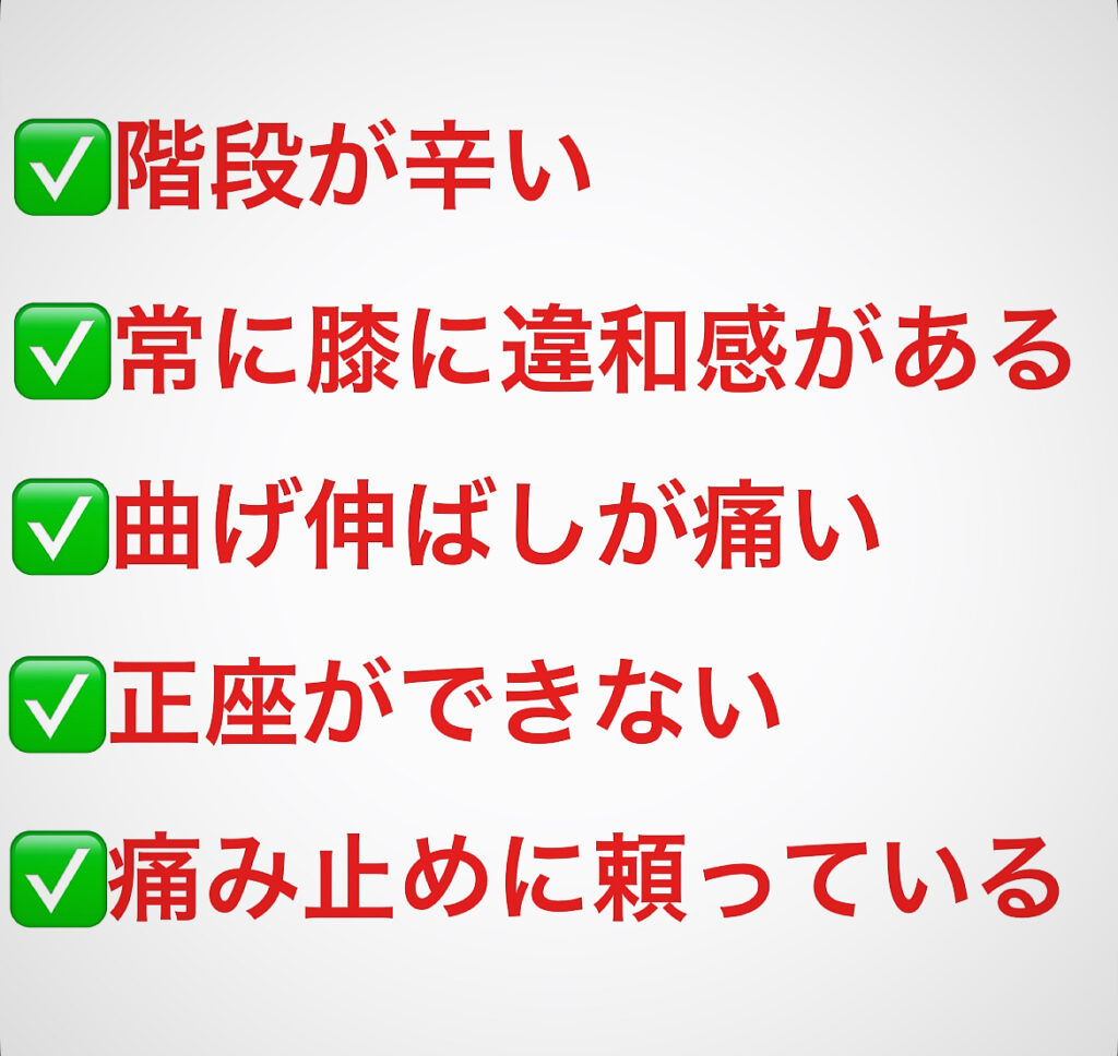 膝の痛みや不調は放っておいてしまうと階段の昇り降りなど日常生活のちょっとしたことに支障をきたしたり足腰が弱くなってしまい様々な不調の原因になってしまう事もあります