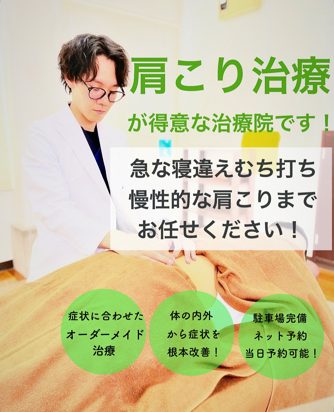 当院では治療を通じて肩こりを改善、肩こり、寝違え、むち打ちになりにくい体づくりなどをさせて頂き健康へ導きます